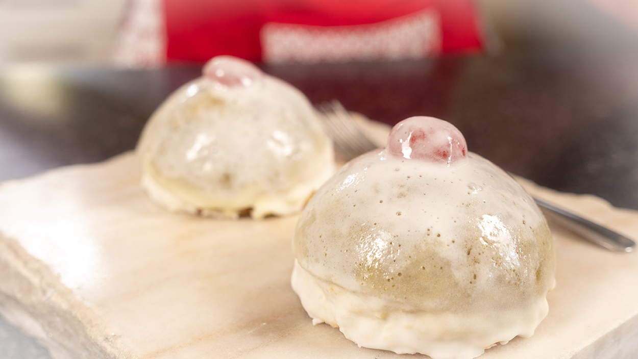 13. Remove chilled moulds from fridge, and unmold cakes onto a wire rack set over a sheet pan. Lightly press cherry “nipples” into marzipan. Pour and smooth icing gently over cakes to coat completely, allowing excess to drip onto sheet pan. Feel free to scoop excess icing from the sheet pan and “recycle” it, so all the cakes are well covered.